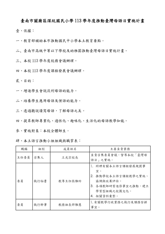 9-1 臺南市105學年度第1學期深坑國小原住民族語開課績效說明表