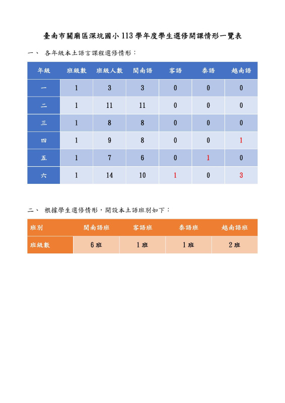 9-1 臺南市105學年度第1學期深坑國小原住民族語開課績效說明表