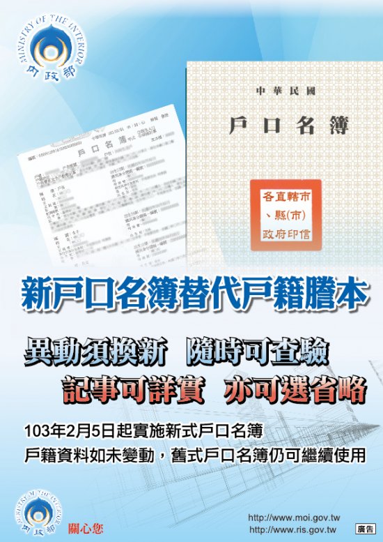 (二)新式戶口名簿之查驗:內政部戶政司全球資訊網建置戶口名簿查驗系統,提供各界查驗所持戶口名簿所載內容是否與戶政機關檔存最新戶籍資料相符。