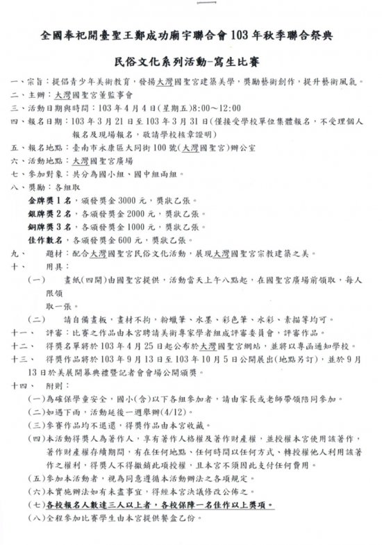 全國奉祀開臺聖王鄭成功廟宇聯合會 103 年秋季聯合祭典 民俗文化系列活動─寫生比賽
