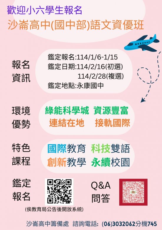 鑑定通過後,歡迎報名 114 學年度沙崙高中(國中部)語文資優班!
