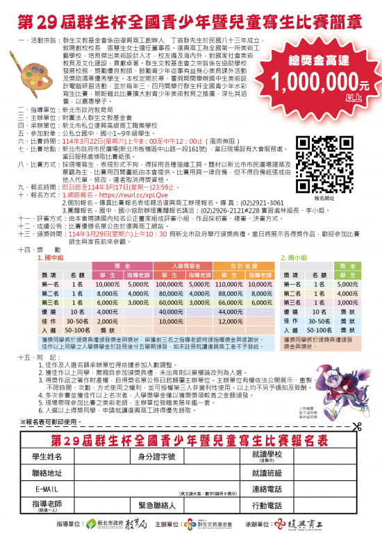 說明:一、比賽時間: 114 年 3 月 22 日(星期六) 上午 8~12 時。(風雨無阻)。二、比賽地點:新北市市民廣場,廣場內所有可供寫生範圍皆可,中央舞台設有服務台領取比賽紙張。三、比賽方式:採現場寫生方式,題材以新北市市民廣場建築及景觀為主,比賽使用四開畫紙,由本會提供,用具一律自備,採用任何描繪工具、材料皆可,表現形式不拘。不得自備紙張或由他人代筆、修改,違者取消資格。四、國中組獲獎同學得入選以上獎狀者,畢業申請本校優先錄取。五、線上報名網址: https://reurl.cc/xpLQve ( 即日起至 114 年 3 月 17 日(一)23:59 止)六、比賽簡章公告於群生基金會網站首頁 http://ischool.fhvs.ntpc.edu.tw/ischool/publish_page/193/ ,敬請下載查閱。