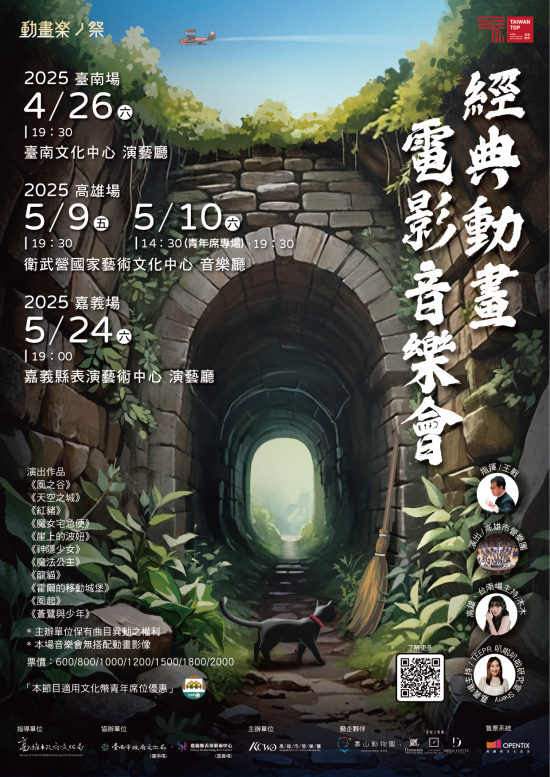 《經典動畫電影音樂會》:4 月 26 日 (六) 19:30 臺南文化中心演藝廳、 5 月 09 日 (五) 19:30 、 05 月 10 日 (六) 14:30(青年席專場)、 19:30 衛武營國家藝術文化中心音樂廳、 5 月 24 日 (六) 19:00 嘉義縣表演藝術中心演藝廳辦理。
