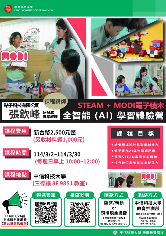 為促進科技教育的普及與發展,本校推廣教育中心特規劃「[STEAM + MODI_電子積木] 全智能 (AI) 學習體驗營」,期望透過創新教學模式,提升學生在人工智慧、程式設計及跨領域學習方面的能力。本課程結合 MODI 電子積木與 Python 程式設計,透過動手實作與互動學習,讓學生在寓教於樂中掌握未來科技趨勢。