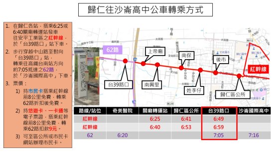 二、因公車駕駛不足,短期內暫無法增加歸仁往學校上學時段班次,公運處提供紅幹線轉乘 62 路往沙崙國際高中相關資訊(如附件)。