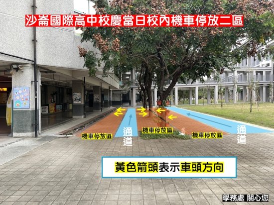 機車停車一區(停車格有限):進校門左轉,由現場人員引導進入停放。