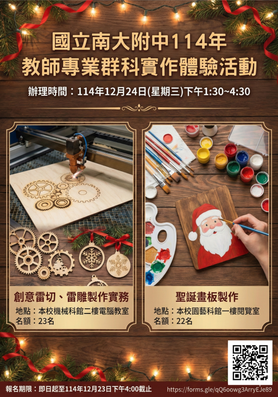 1.創意雷切、雷雕製作實務/本校機械科館二樓電腦教室 2.聖誕畫板製作/本校園藝科館一樓閱覽室