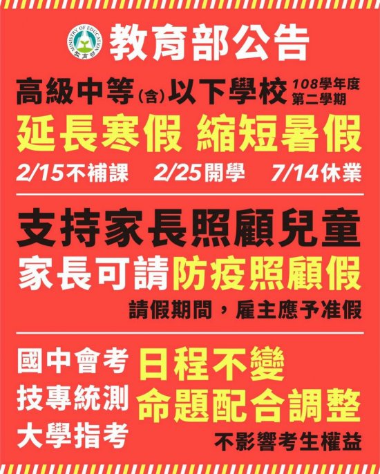 為因應武漢肺炎防疫,教育部宣布高中以下學校延至 2 月 25 日開學,上課日數不變, 7 月 14 日辦理休業式。相關訊息詳如附件。