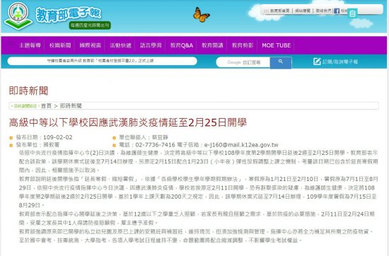 武漢肺炎防疫,教育部宣布108學年度第二學期開學日延後至109年02月25日開學
