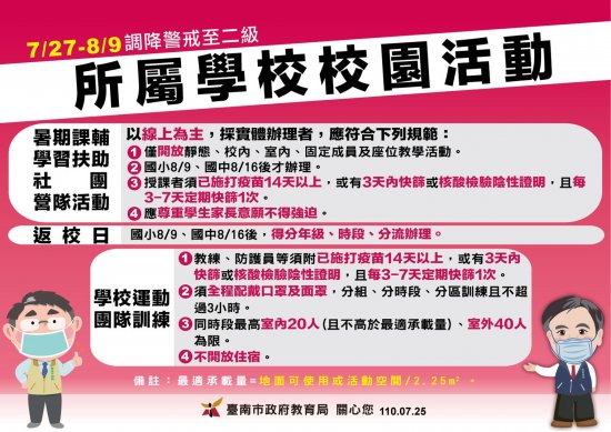 緊急公告:因應教育局最新防疫措施,原訂 0802(星期一)返校日取消,新校長就職典禮改 0809(星期一)上午舉行,煩請三慈國小全體教職員工同仁撥冗參加,學生當日免到校觀禮。另外,成大歷史營亦因最新防疫措施改至 0810(星期一)至 0814(星期六)辦理,原訂英語營因故取消,若造成不便之處,敬請見諒!