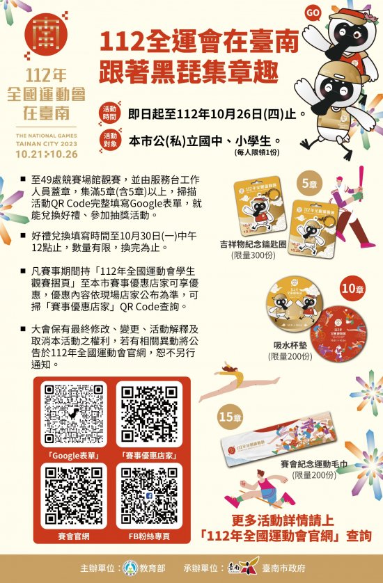 五、檢附「112 全運會在臺南跟著黑琵集章趣」活動計畫書(附件 1)、活動海報(附件 2)及學生觀賽摺頁(附件 3)各 1 份。