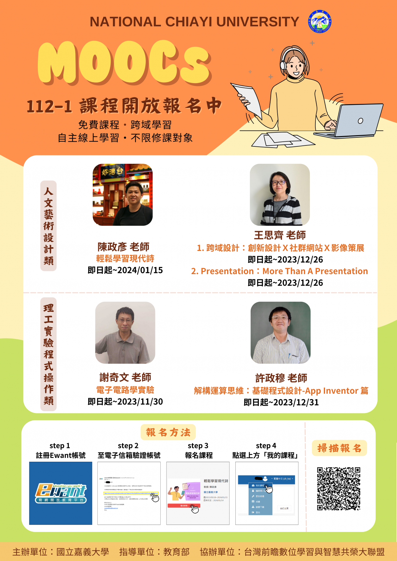 一、磨課師課程( MOOCs )為全球數位學習新趨勢,課程以線上方式做為學習場域,學習不再侷限於地域,學員亦可享受大專院校高品質數位課程進行學習,本校已開設 5 門磨課師課程於育網 Ewant 平臺,課程開放報名中,歡迎有興趣者免費修習,提升自我實力。
