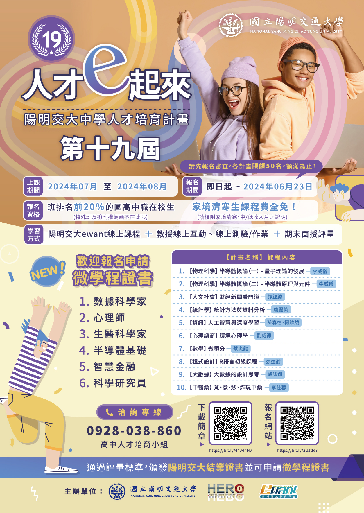 三、計畫內容:第十九期開課計畫包含(1) 物理科學人才培育計畫、(2) 人文社會人才培育計畫、(3) 統計學人才培育計畫、(4) 資訊人才培育計畫、(5) 心理諮商人才培育計畫、(6) 數學人才培育計畫、(7) 程式設計人才培育計畫、(8) 大數據人才培育計畫、(9) 財經人才培育計畫、(10) 中醫藥人才培育計畫。可參考附件一報名簡章各科開課說明,請詳閱計畫網站 https://ewanths.nycu.edu.tw 各計畫課程說明。