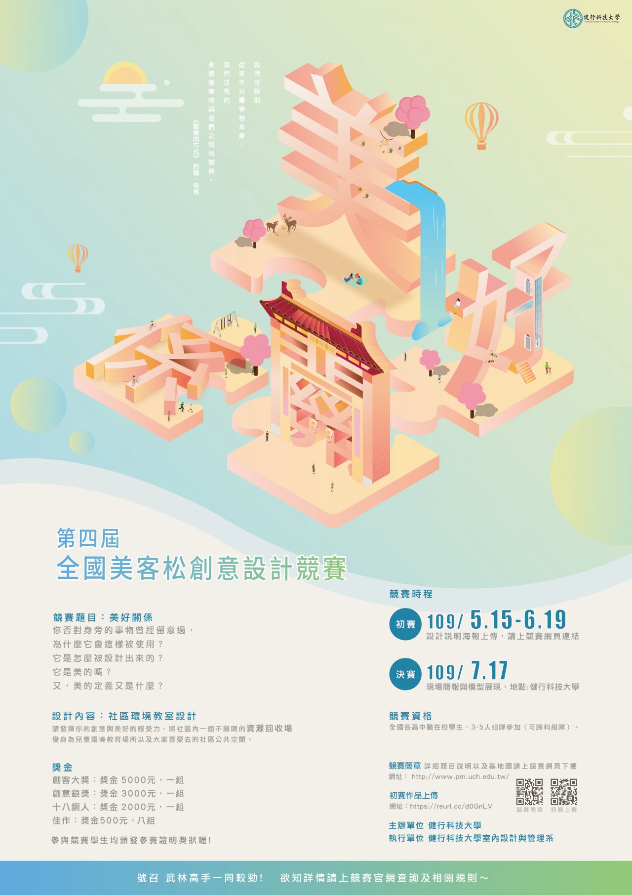 主旨:健行科技大學舉辦第四屆美客松全國創意設計競賽-美好關係,公開徵選設計構想方案,鼓勵全國高中職學生組隊參加,敬請惠予公告並鼓勵學子踴躍參與。