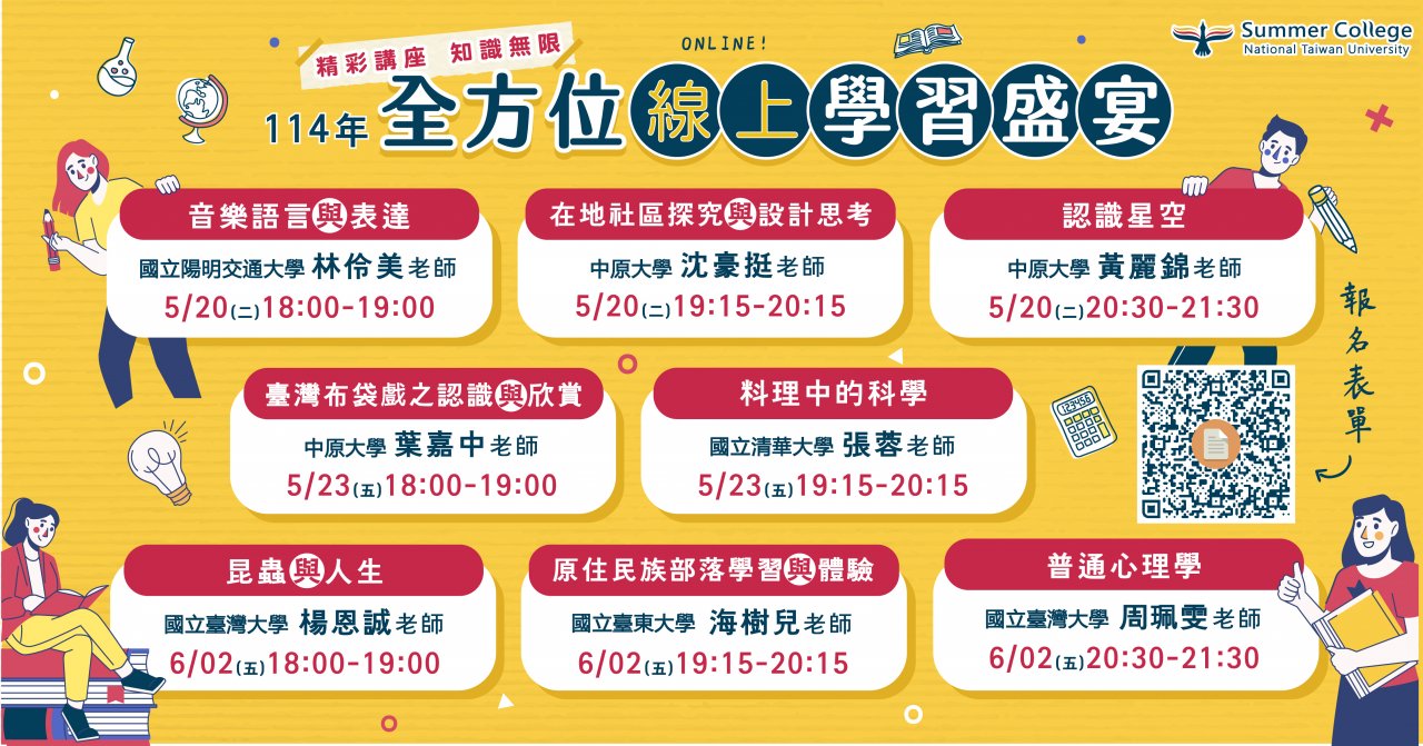 一、本( 114 )年度全國夏季學院課程於 6 月 9 日至 8 月 27 日期間上課,部分課程開放高中生修課,參見 114 年臺大全國夏季學院課程清單(高中版)官網公告: https://www.n2.org.tw/enter/news/detail/279 ,詳細課程資訊請至官網瀏覽: https://www.n2.org.tw/enter/lesson