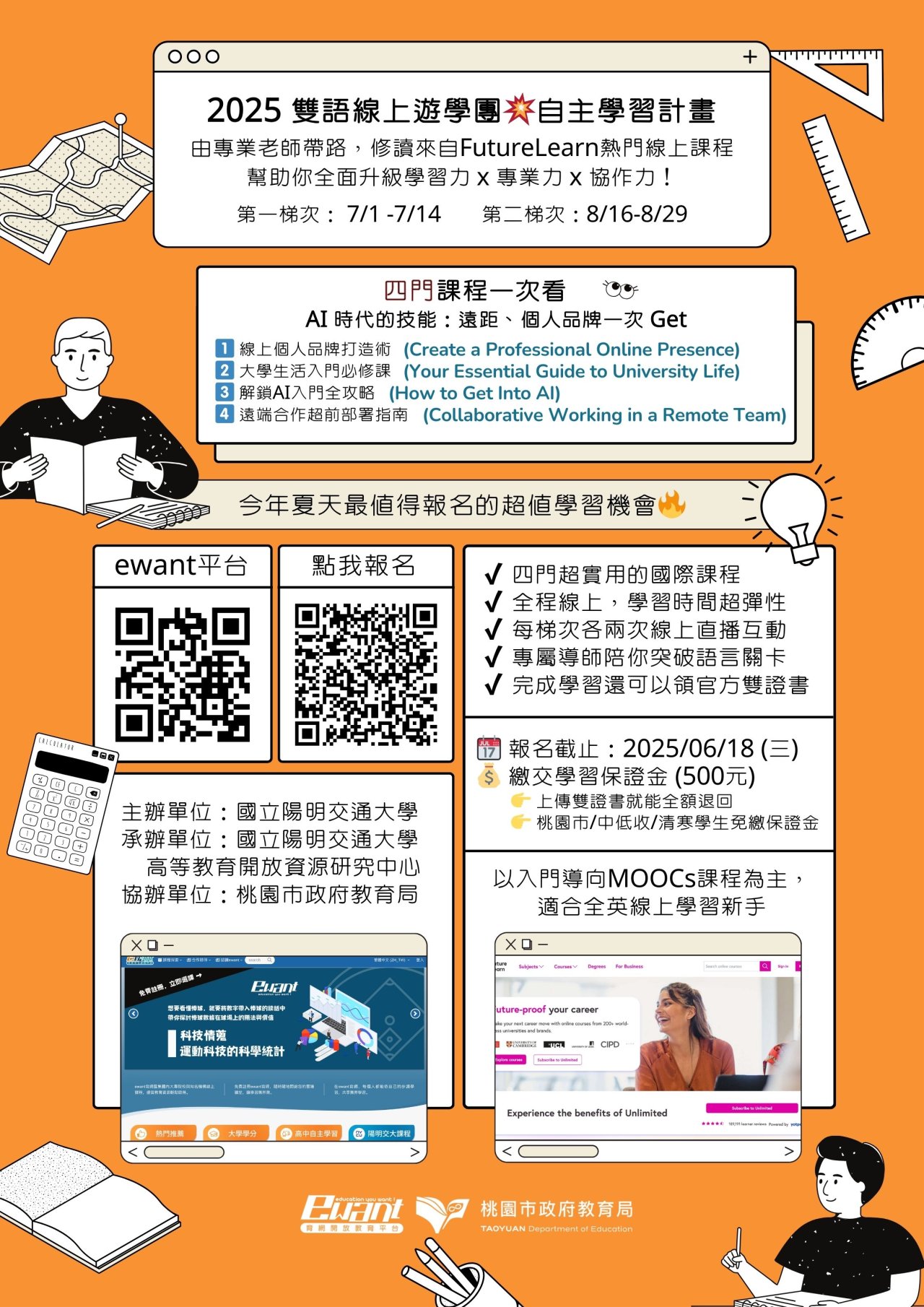 三、旨揭雙語線上遊學團包含「線上個人品牌打造術 (Create a Professional Online Presence)」、「大學生活入門必修課 (Your Essential Guide to University Life)」、「解鎖 AI 入門全攻略 (How to Get Into AI)」、「遠端合作超前部署指南 (Collaborative Working in a Remote Team)」等四門課程。