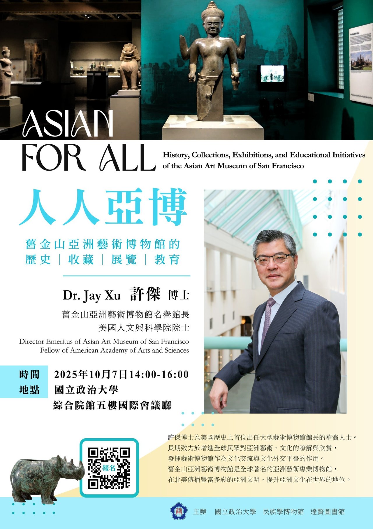 一、本次講座特別邀請美國舊金山亞洲藝術博物館名譽館長許傑博士擔任主講人。許博士於西元 2015 年獲選為美國人文與科學院院士,並於西元 2017 年擔任館長期間,促成該館與國立故宮博物院締結為姊妹館。任內致力於推動全球對亞洲藝術與文化之認識與欣賞,強化博物館作為國際交流與文化外交的重要平臺。