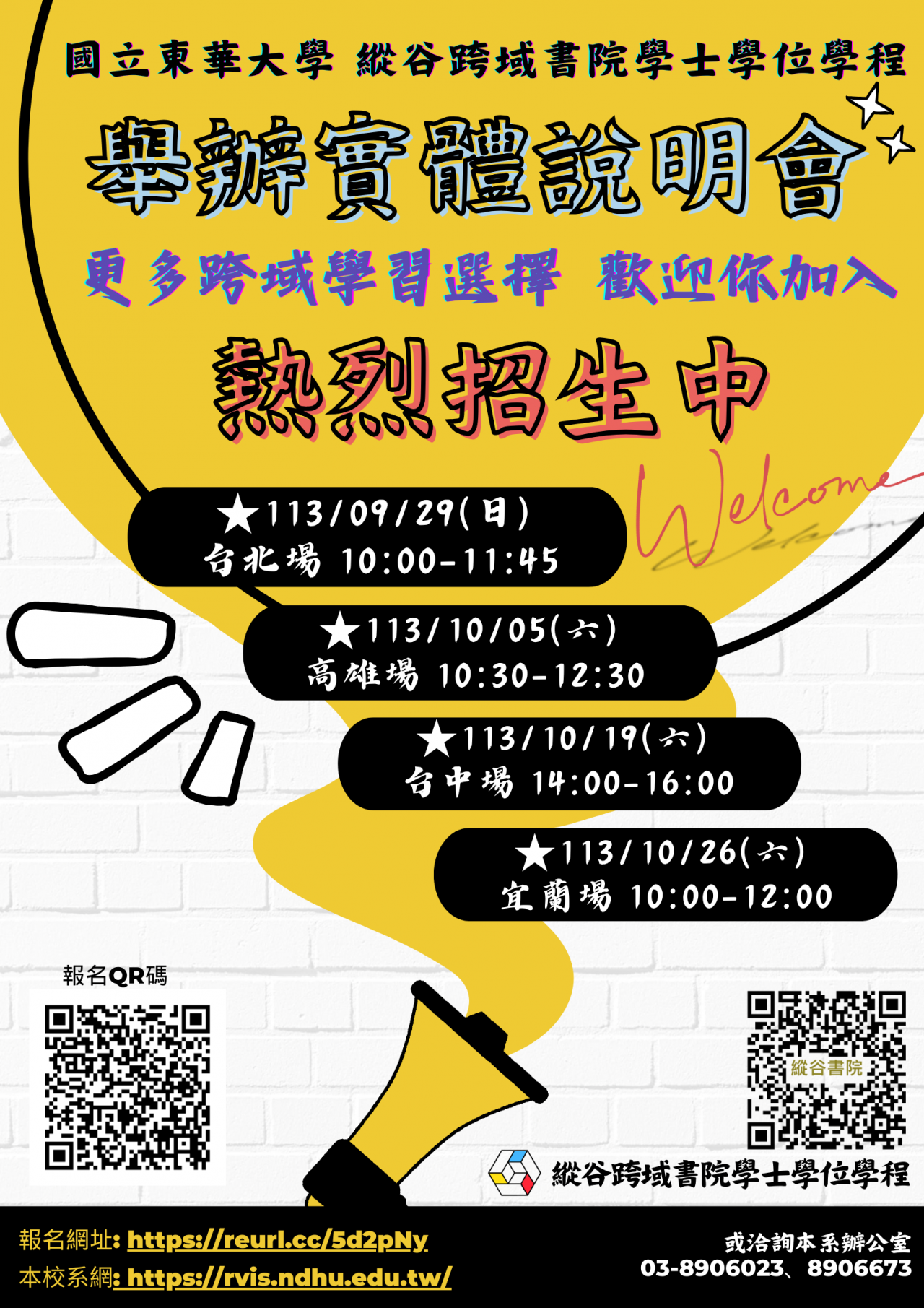 一、在這個快速變動的時代,「跨領域」有如回應社會需求的一把鑰匙,縱谷跨域書院學士學位學程,希望透過「專題發展專業」的育才模式,引領學子開發自我潛能與生命價值,成為「自覺」、「自主」、「自信」的跨領域人才。 114 學年度招生說明會開跑,報名相關資訊如下: