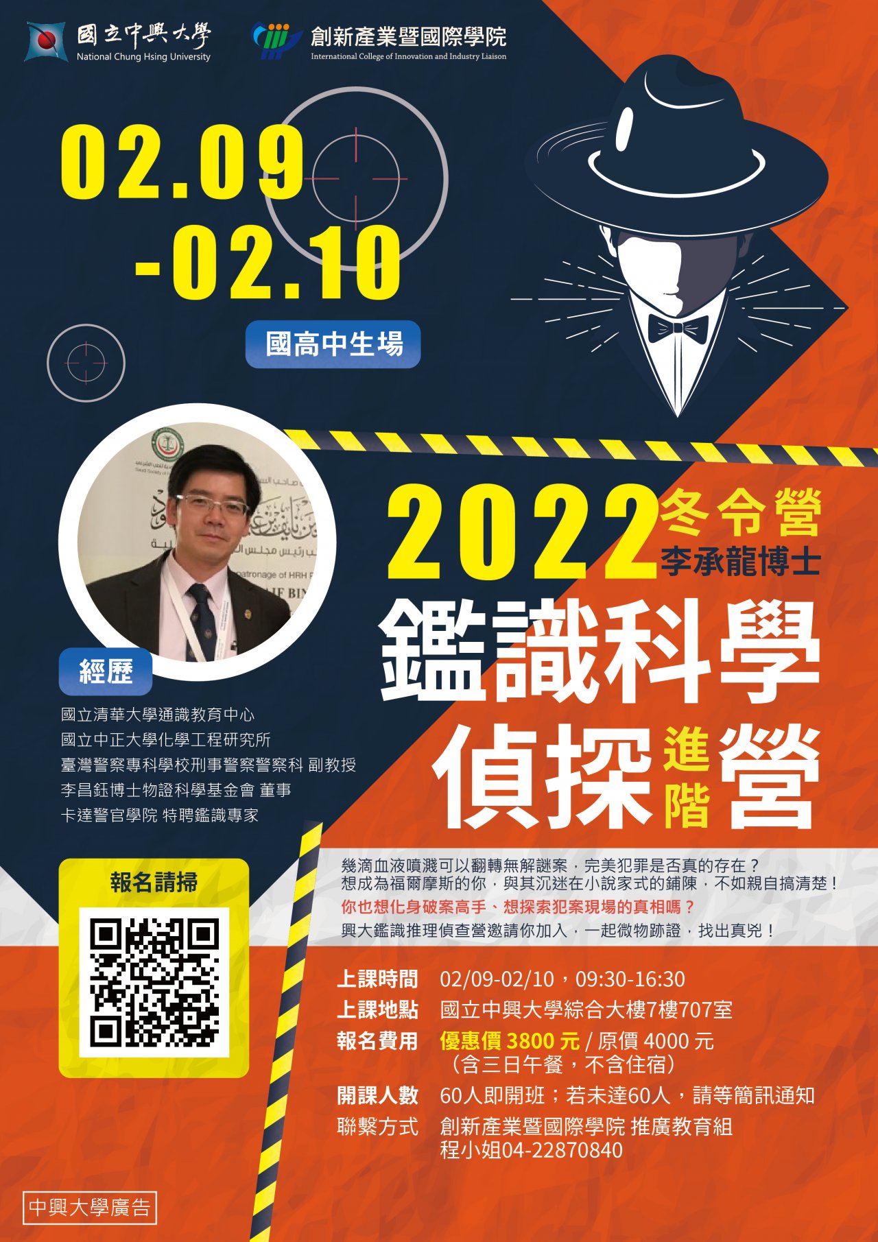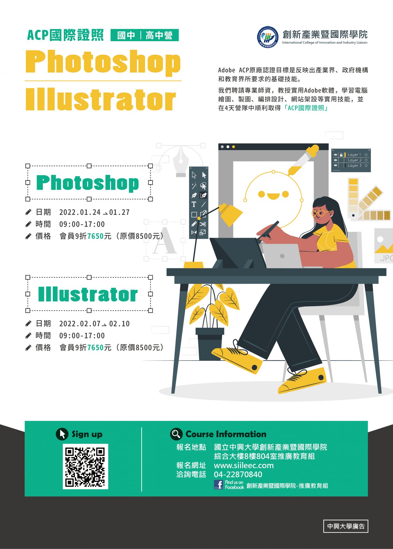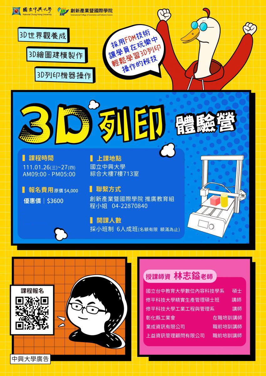 說明: 一、本校將於 111 年 1 月 26 日起舉辦旨揭營隊課程,幫助青少年 探索自我,接軌 108 年度新課綱實施 STEAM 學習,累積自我 學習歷程。各課程特色如下: (一)想體驗運用科學辦案技能,《鑑識科學偵探進階》帶你 由巨人肩膀從碎木機冷血殺妻案,破解無屍命案。 (二)進入 3D 列印世界,讓你把想像力,立體實現化,帶你 《瘋玩 3D 列印體驗營》。 (三)為啟發國高中生多元學習,協助學生考取 Photoshop 及 Illustrator 等 ACP 國際證照。 (四)師資由勞動部勞動力發展署職前培訓講師楊振昇、林志 鎰授課,鑑識營邀請臺灣警察專科學校刑事警察科李承 龍副教授主講,歡迎有興趣學生加入。 二、招生對象:全國公私立國中、高中職、學生,有電腦基礎 檔 號: 保存年限: 4 . . . . . . . . . . . . . . . . . . . . . . . . . . . . . . 裝 . . . . . . . . . . . . . . . . 訂 . . . . . . . . . . . . . . . . 線 . . . . . . . . . . . . . . . . . . . . . . . . . . . 第 2 頁,共 2 頁 者。 三、營隊資訊如下: (一)Photoshop 日期: 111 年 1 月 24 日至 1 月 27 日。 (二)Illustrator 日期︰111 年 2 月 7 日至 2 月 10 日。 (三)3D 列印體驗日期: 111 年 1 月 26 日至 1 月 27 日。 (四)鑑識科學日期︰111 年 2 月 9 日至 2 月 10 日。 (五)地點:國立中興大學綜合大樓教室。 (六)費用請參卓報名網站資訊。 (七)報名方式:請至本校創產學院線上報名系統報名 (http://www.siileec.com/index.php? subject_type=38)。至「國立中興大學創新產業暨國際 學院線上報名繳費系統」,點選「國高中生研習」加入 會員即可報名。。 四、聯絡窗口:本校創新產業暨國際學院推廣教育組,電話 (04)22870840 ,詳情請參簡章與海報。