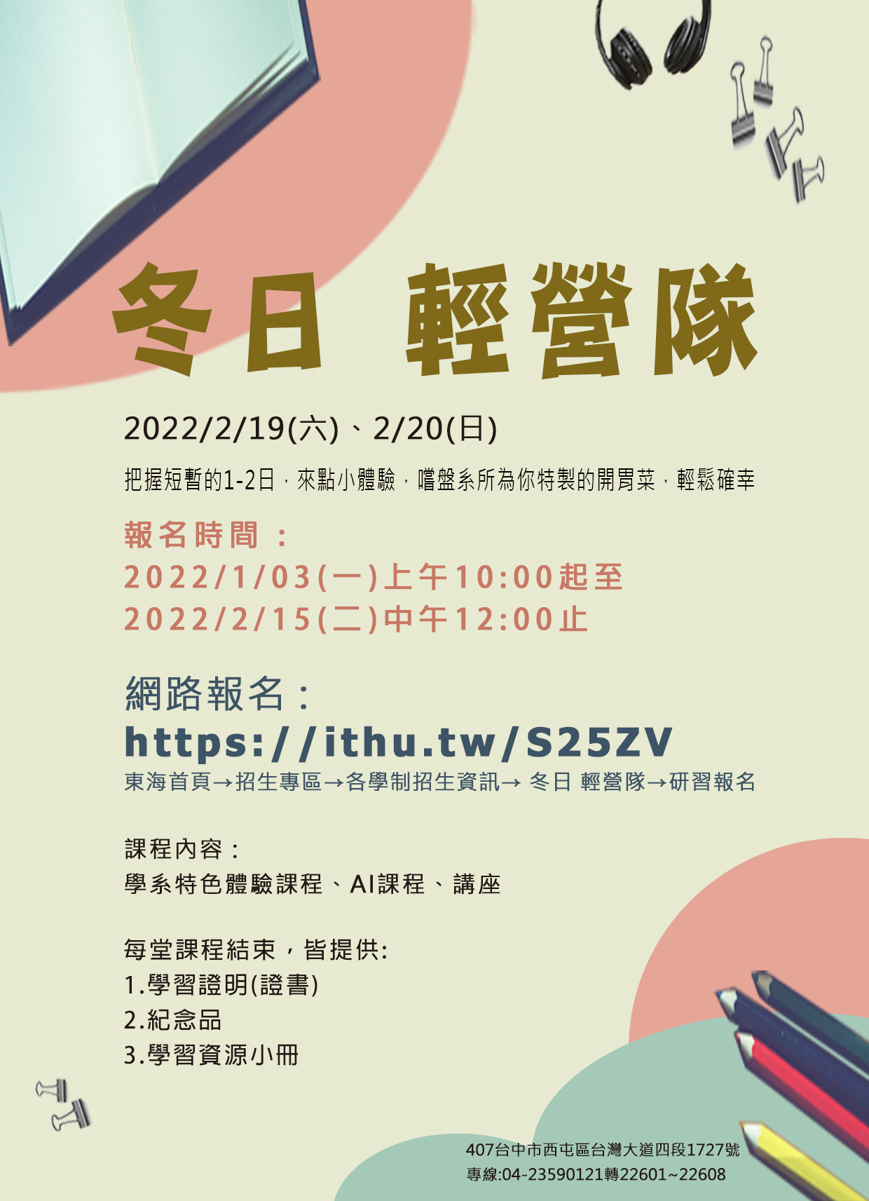 一、為協助高中生探索大學生涯發展及興趣,本校特於 111 年 2 月 19〜20 日(星期六〜日)辦理 2022「冬日 輕營隊」。