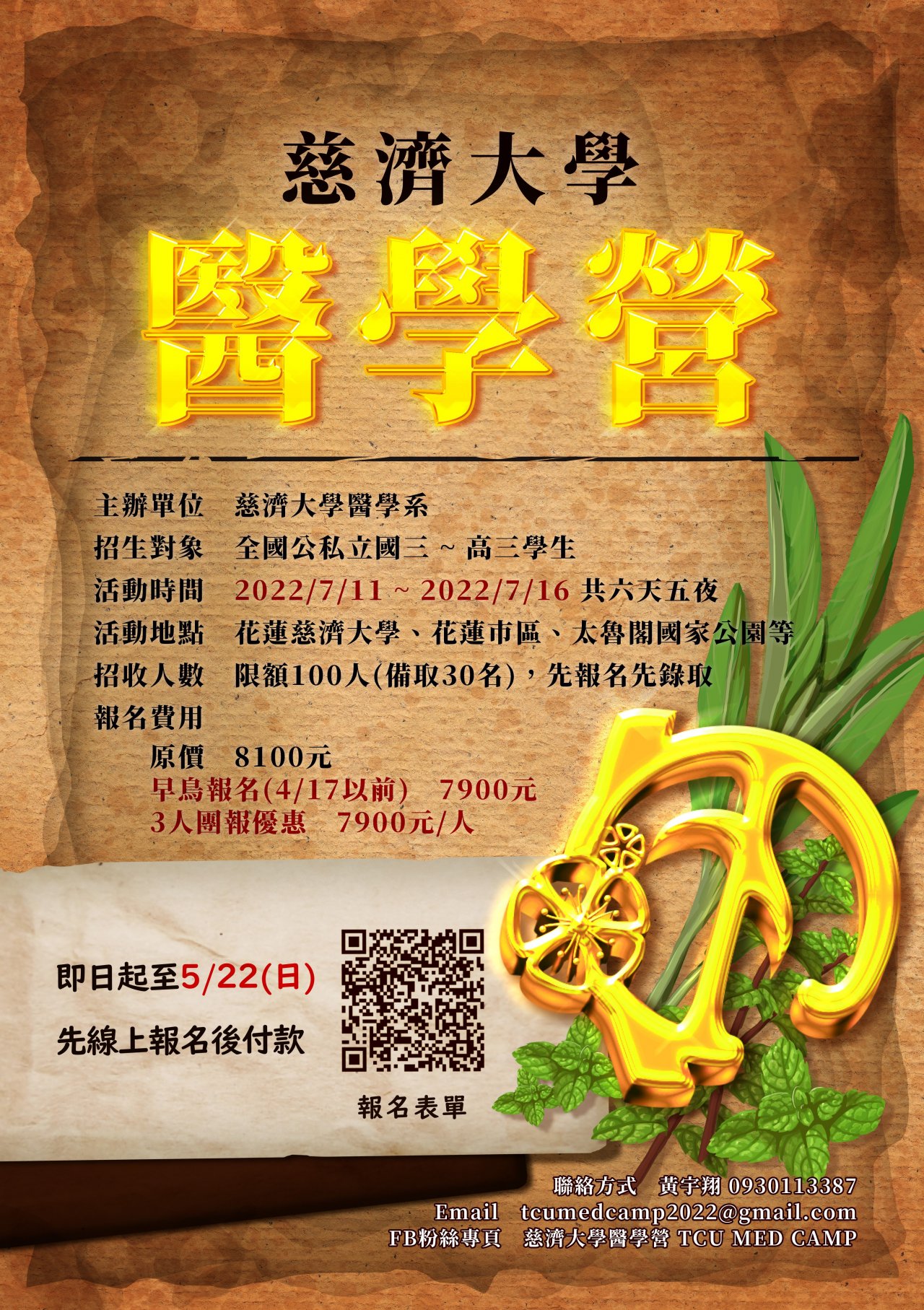 七、醫學營連絡人: 醫學系四年級黃宇翔同學 (聯絡電話: 0930113387 、電子信箱: 107311131@gms.tcu.edu.tw)。