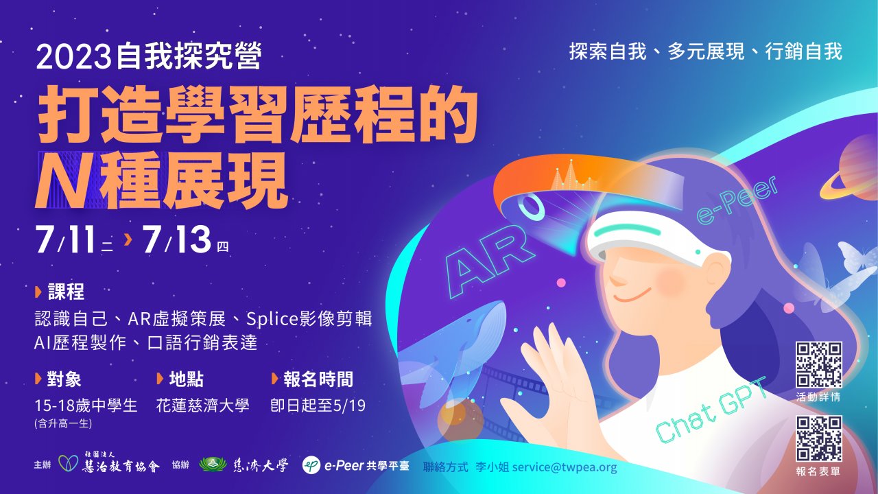 一、慧治教育協會為落實「適性揚才」之理念,希望能運用網路與 3C 輔助幫助同學了解自我價值、找到自己的目標和定位以及開創多元可能性,以協會所在地-花蓮地區為聚點,舉辦三天兩夜的自我探索營隊,讓同學們透過認識自我、探索自我及行銷自我為主軸的課程,搭配 AR 、 chatGPT 以及 e-Peer 共學平台 等科技工具的運用,加上社群共學、同儕互動的力量的相輔相成,發揮本次營隊最大化的價值與效益,讓每一位同學在參與後對於生涯有更明確的方向。