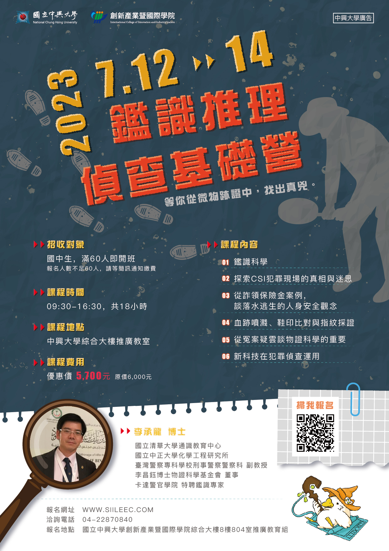 (三)師資由臺灣警察專科學校刑事警察科李承龍副教授、歐德卡科技公司機電整合總工程師徐鴻義及愛迪爾科技公司技術總監陳蓁主講,歡迎有興趣學生加入。