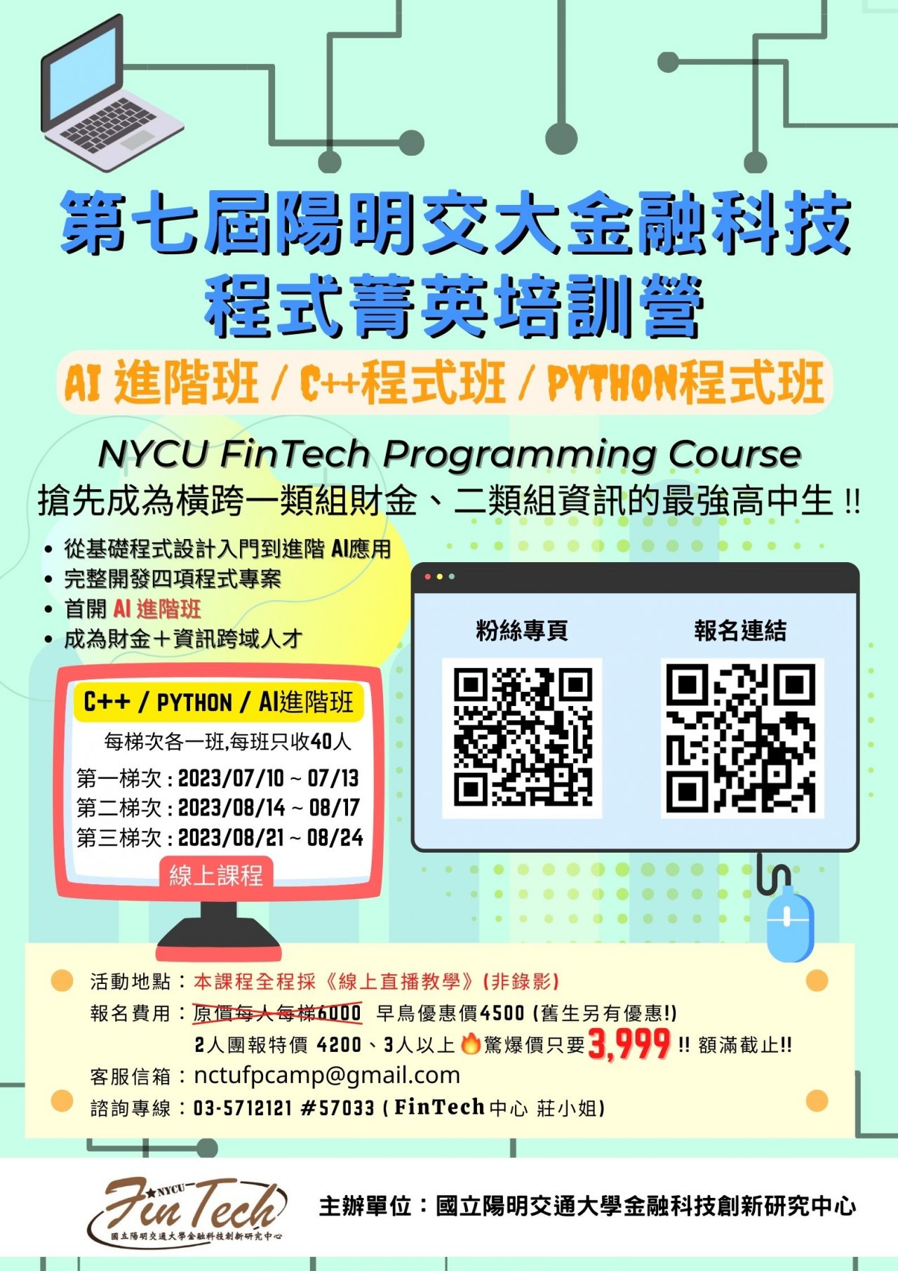 一、「2023 第七屆國立陽明交大金融科技程式菁英培訓營」藉由豐富有趣的課程規劃、深入淺出教學,輕鬆地學習 C++、 Python 之基本概念與實作技巧。今年新開設「AI 進階班」,名額有限敬請把握!