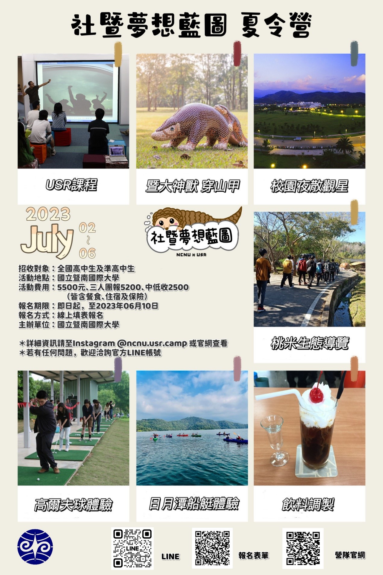 四、詳細活動資訊,請參閱附件活動海報、招生簡章及營隊時間表。即日起開放報名至 112 年 6 月 10 日(星期六)止,歡迎轉知並鼓勵學生踴躍報名參加。