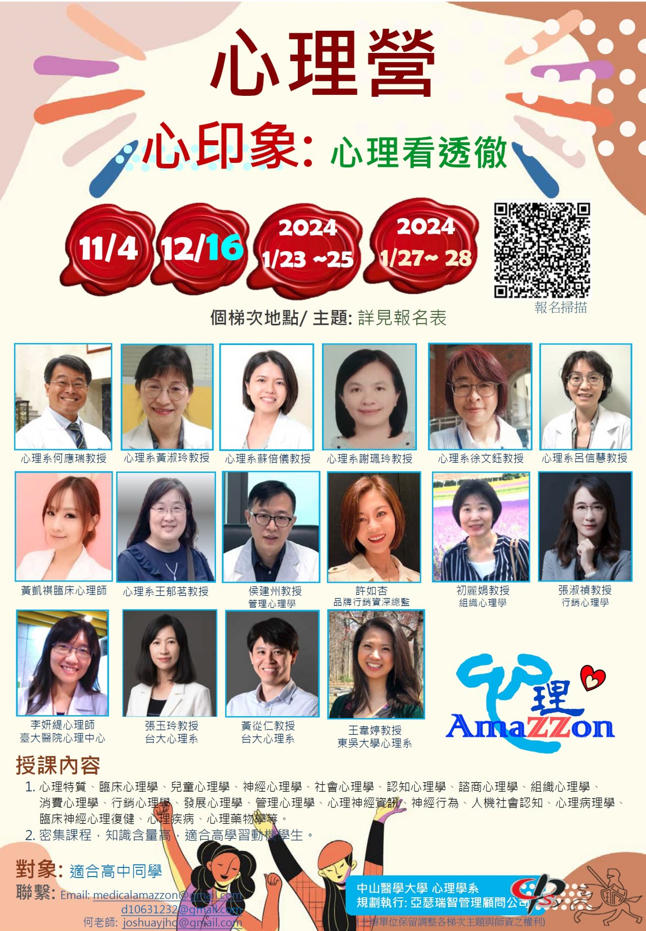 一、為提升高中生對心理相關學系之了解,特規劃心理營,分四個梯次,歡迎報名參加。