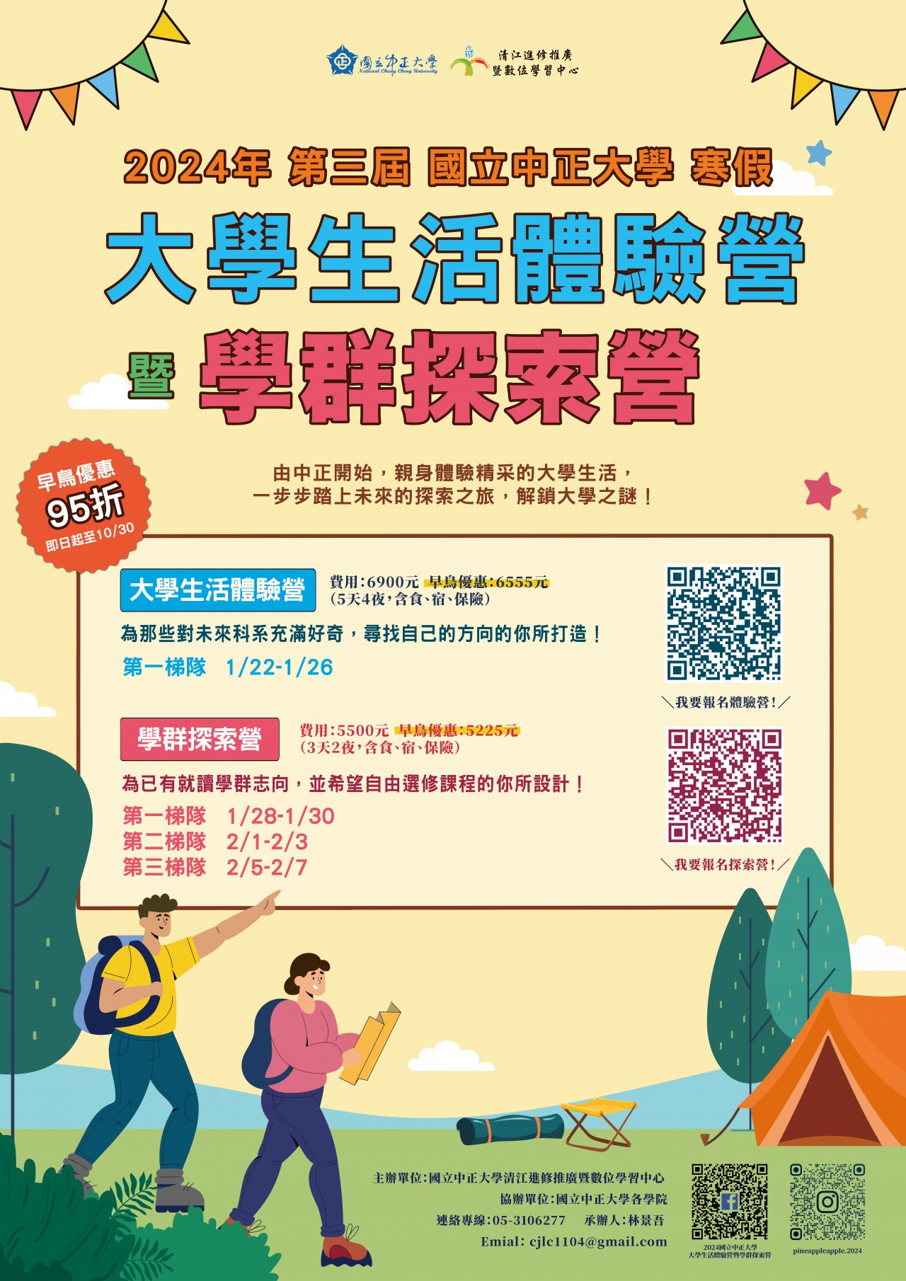 1、大學生活體驗營: 113 年 1 月 22 日至 1 月 26 日,五天四夜,共一梯次。
