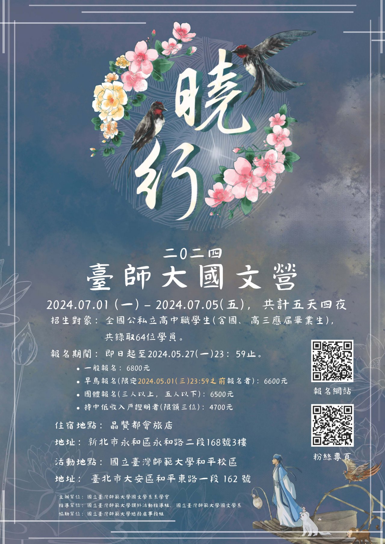 三、本營隊所開設之課程,除由本校國文學系教授授課外,另邀請國內著名專家學者授課,詳細資料請見網站: 2024 臺師大國文營《曉行》 FB 粉絲專頁或 IG 粉絲帳號:@2024ch_camp 。