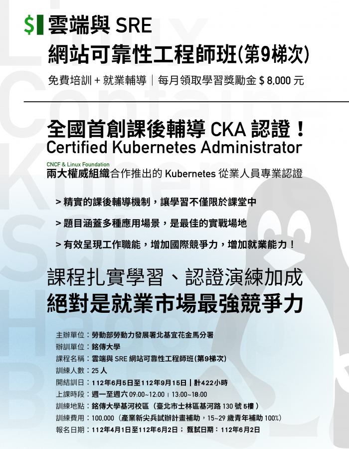一、為因應 SRE 網站可靠性工程師廣大人才需求,並配合政府「亞洲矽谷」計畫,以協助青年就業,本校規劃辦理雲端與 SRE 網站可靠性工程師班。