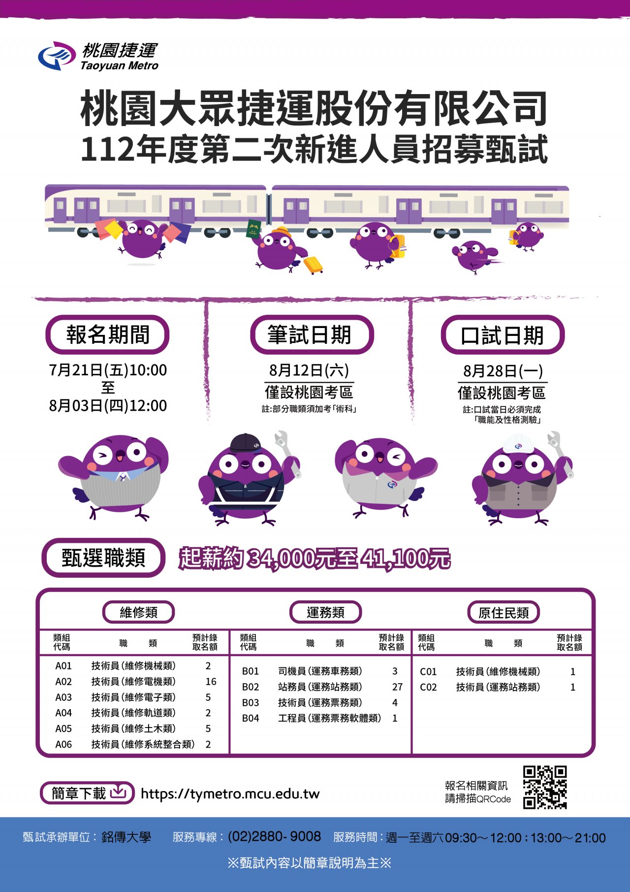一、旨揭報名時間自 112 年 7 月 21 日(星期五)10:00 至 8 月 03 日(星期四)中午 12:00 止,簡章下載及報名網址:https://tymetro.mcu.edu.tw/。