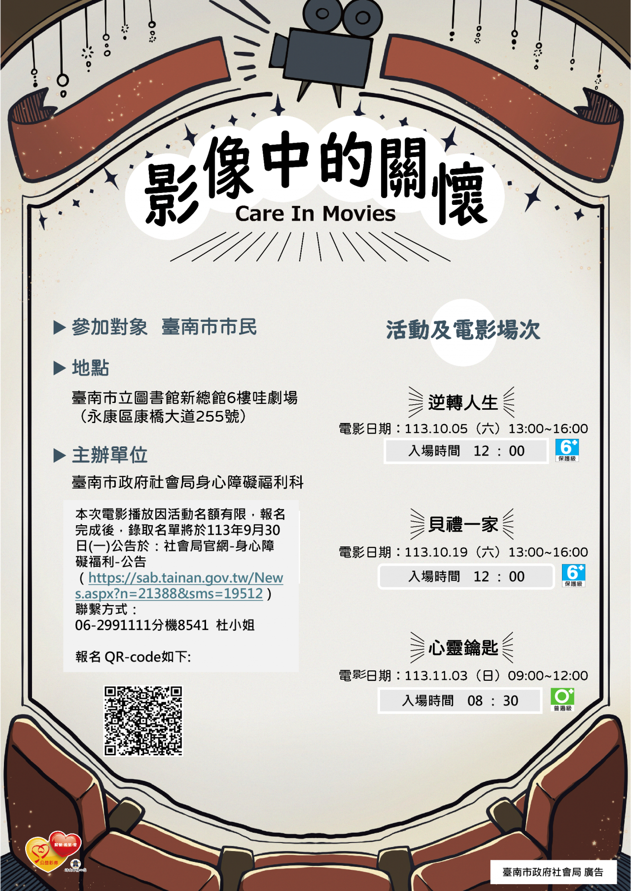 六、本次電影播放因場地座位有限,報名完成後,錄取名單將於 113 年 9 月 30 日(星期一)公告於:社會局官網-身心障礙福利-公告( https://sab.tainan.gov.tw/News.aspx?n=21388&sms=19512 )