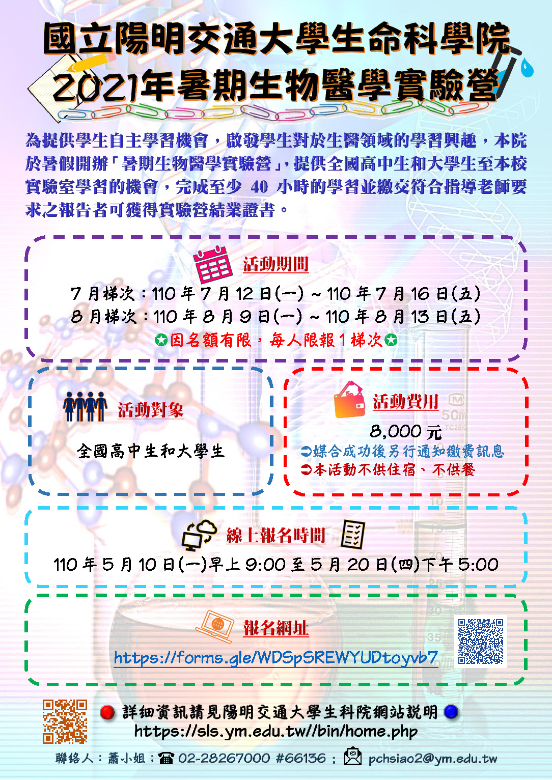 一、為提供高中生和大學生更多自主學習機會,並啟發學生對於生醫領域的學習興趣,國立陽明交通大學生命科學院於 110 年暑假續辦「暑期生物醫學實驗營」。學生完成至少 40 小時的學習並繳交符合指導老師要求之報告者可獲得實驗營結業證書。