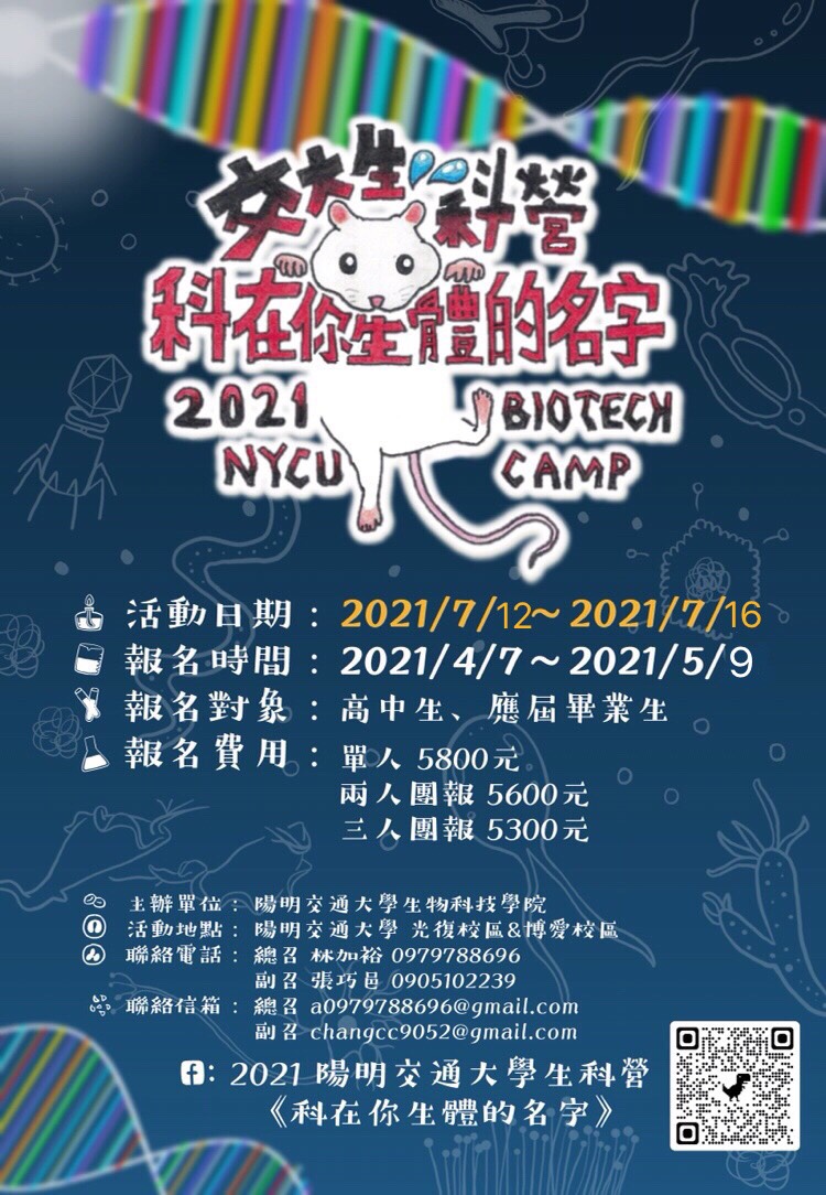 一、本校生物科技學系學生預計於 2021 年 7 月 12 日至 2021 年 7 月 16 日舉辦生科營《科在你生體的名字》,檢附活動宣傳單 DM 。