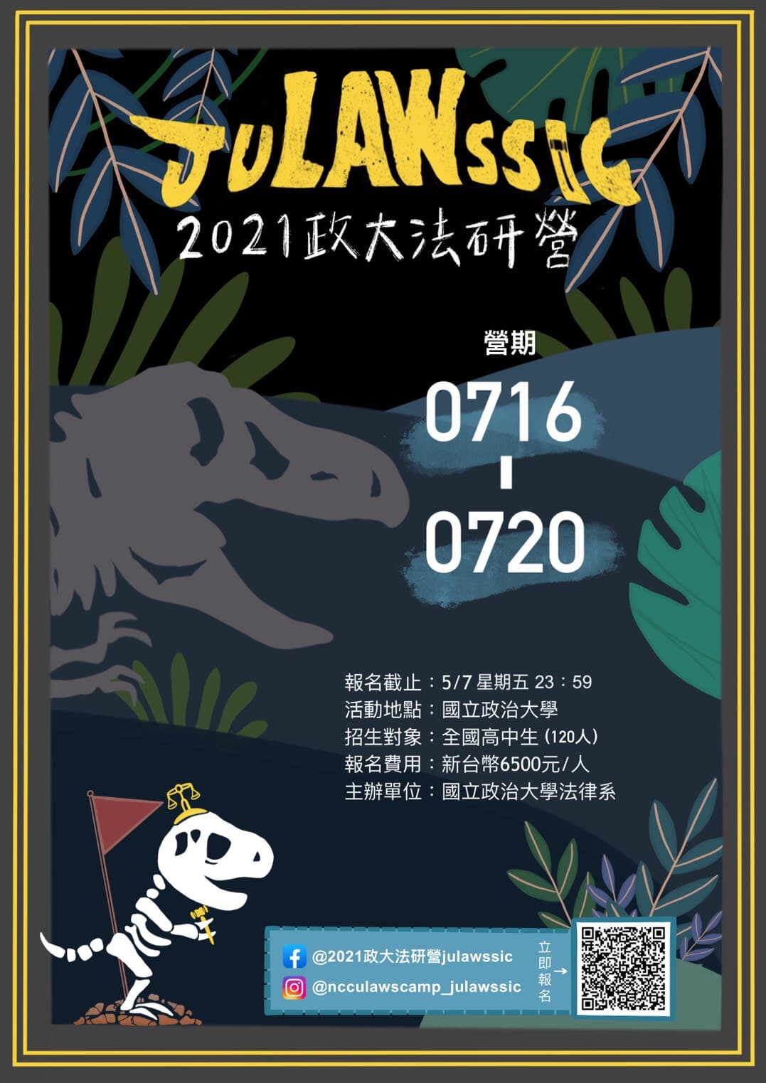 二、第二十六屆「政大法律全國高中生法律研習營」以「 julawssic 」為主題,招生對象為全國高中生,預計招收 120 名學員。