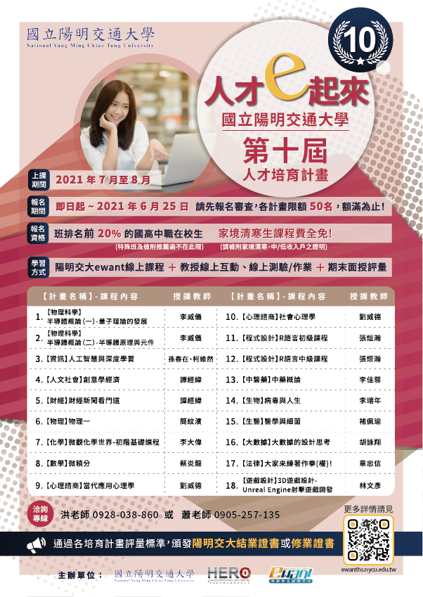 十、檢附計畫海報供參。詳細計畫內容請至該校中學人才培育計畫網站 https://ewanths.nycu.edu.tw 查詢、報名,或洽計畫聯絡窗口:洪老師 0928-038860 ,蕭老師 0905-257135 。