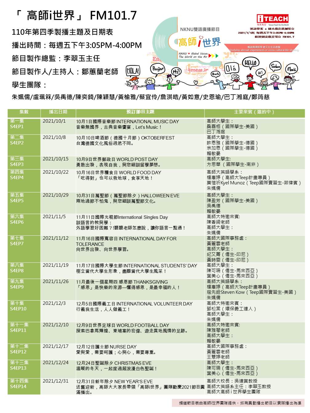 一、該校英語學系配合國家推動國際教育 2.0 政策及 2030 年雙語國家政策,製播雙語廣播節目「高師 i 世界」。