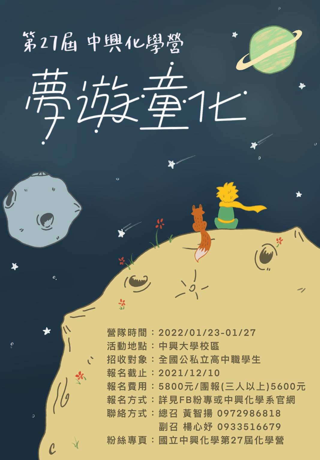 八、報名方式及活動說明:請至 Facebook 粉絲專頁查詢。 Facebook 粉絲專頁:國立中興大學第二十七屆化學營