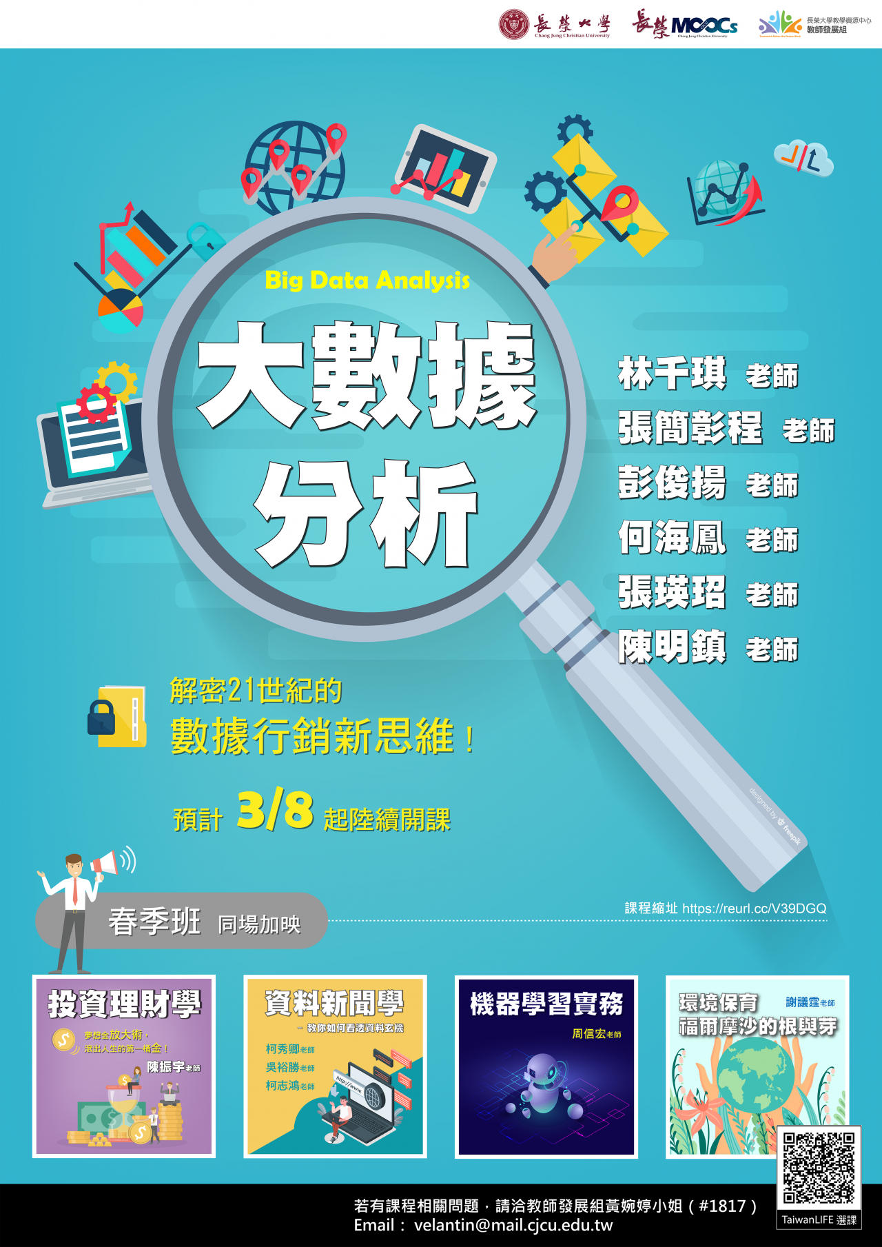 1、「大數據分析:解密 21 世紀的數據行銷新思維」共計 6 週 6 小時,課程網址 https://reurl.cc/02aZM9 。