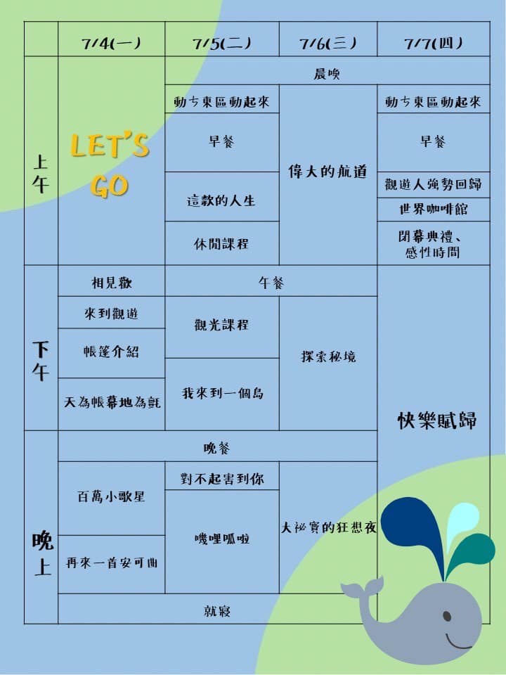 二、活動特色:內容包含露營、賞鯨、體驗課程、師長主題授