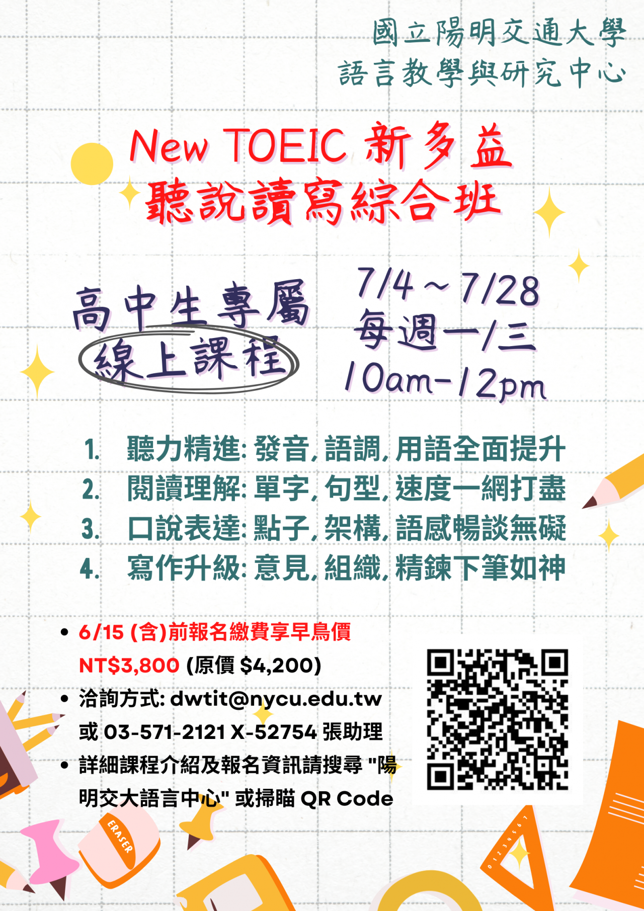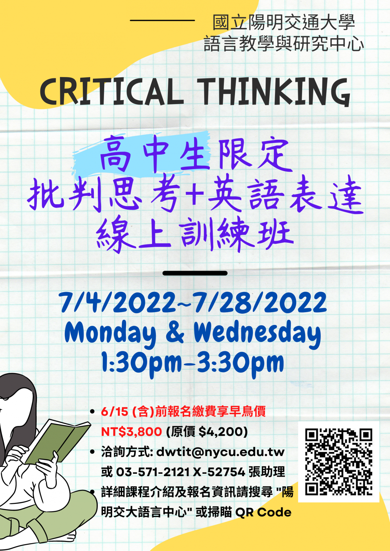 、上課時間: 111 年 7 月 4 日-111 年 7 月 21 日每週一、三(上午 10:00-12:00 :高中生 TOEIC 聽說讀寫班、下午 13:30-15: 30 :高中生 Critical Thinking 批判思考班)。亦可單選 其中一課程報名。