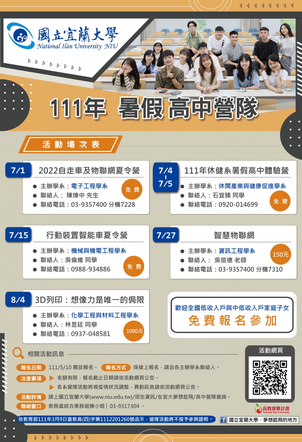 國立宜蘭大學111年暑假期間辦理高中主題營隊活動