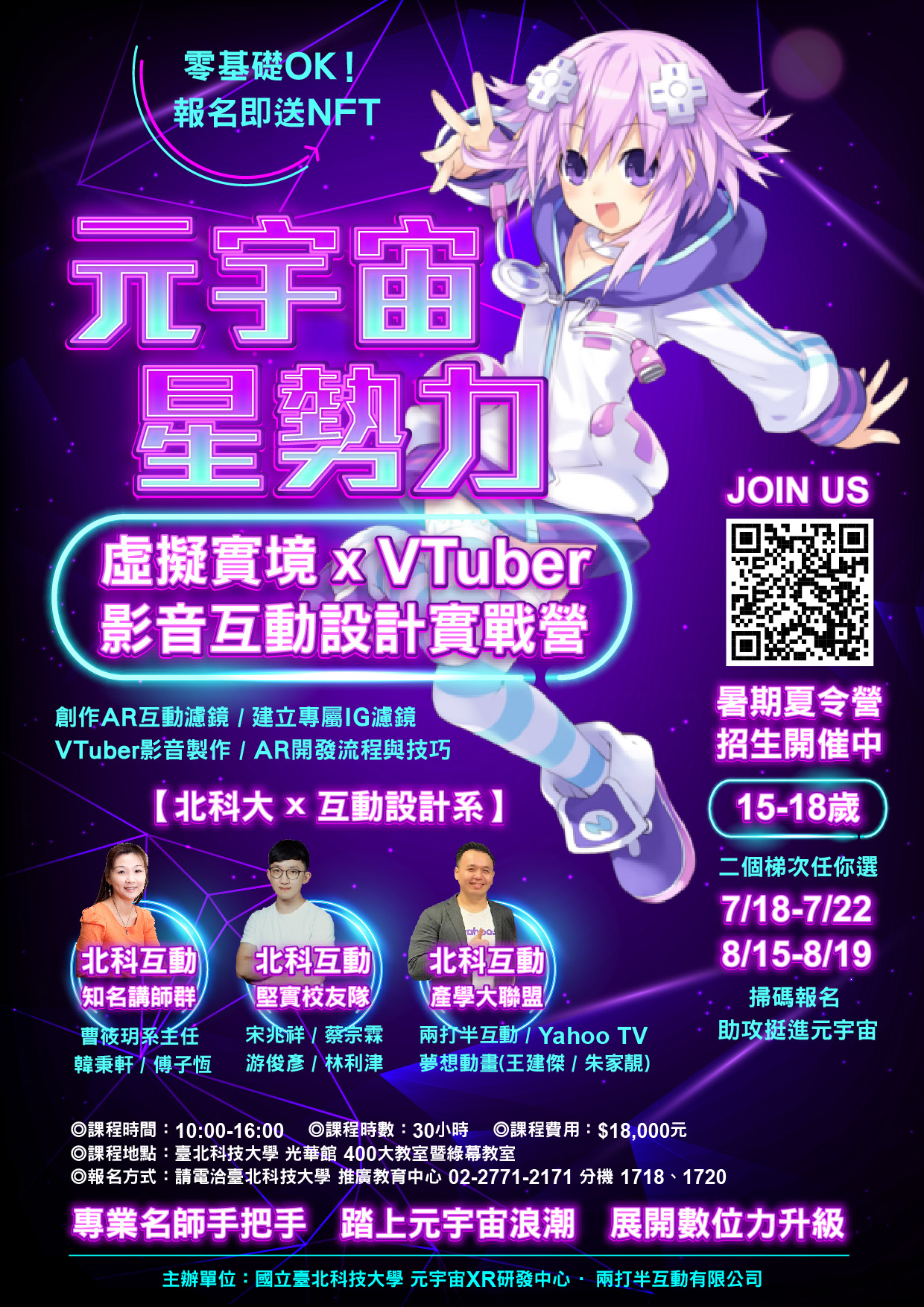 三、活動資訊請以 google 搜尋:「臺北科大 迎向元宇宙【虛擬實境 x VTuber 影音互動設計】實戰訓練營,進入本校活動網頁查詢,或請來電本校推廣教育中心(02)2771-2171 分機 1720 、 1718 洽詢。