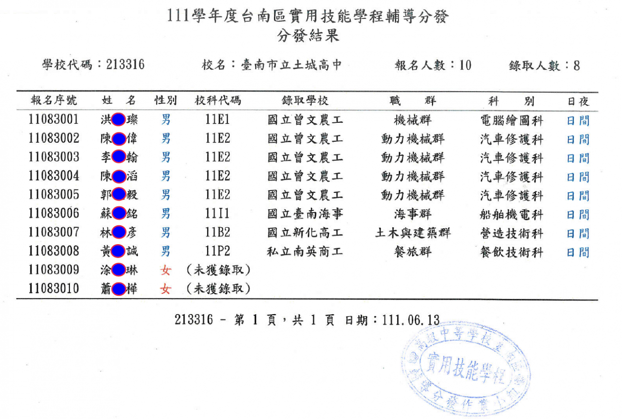 111實用技能班分發結果