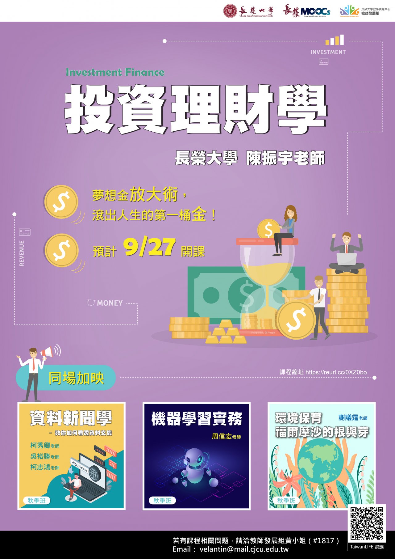 1、「投資理財學:夢想金放大術,滾出人生第一桶金!」共計 4 週 4 小時,課程網址 https://reurl.cc/pM5N7a