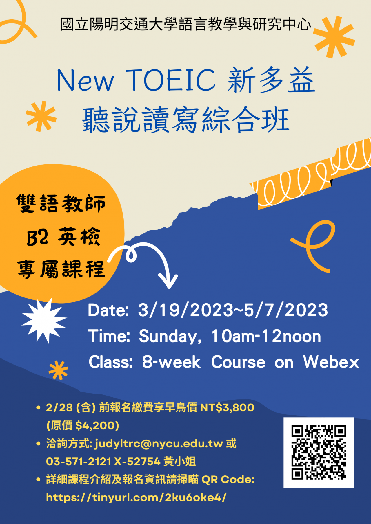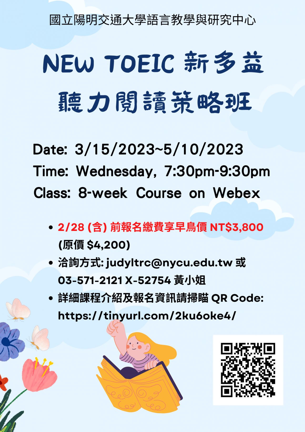 一、為提升全國各級校院學生之英外語能力,本校語言教學與研究中心於 111-2 學期開設全遠距外語進修班(NEW TOEIC 新多益聽說讀寫綜合班、 NEW TOEIC 新多益聽力閱讀策略班、 CREATIVE THINKING + ENGLISH PRESENATION 創意思考與英語簡報特訓班、生活旅遊日語 - 「學了,就能立即開口說!」日語會話系列課程 I),歡迎各校學生或社會人士踴躍報名。