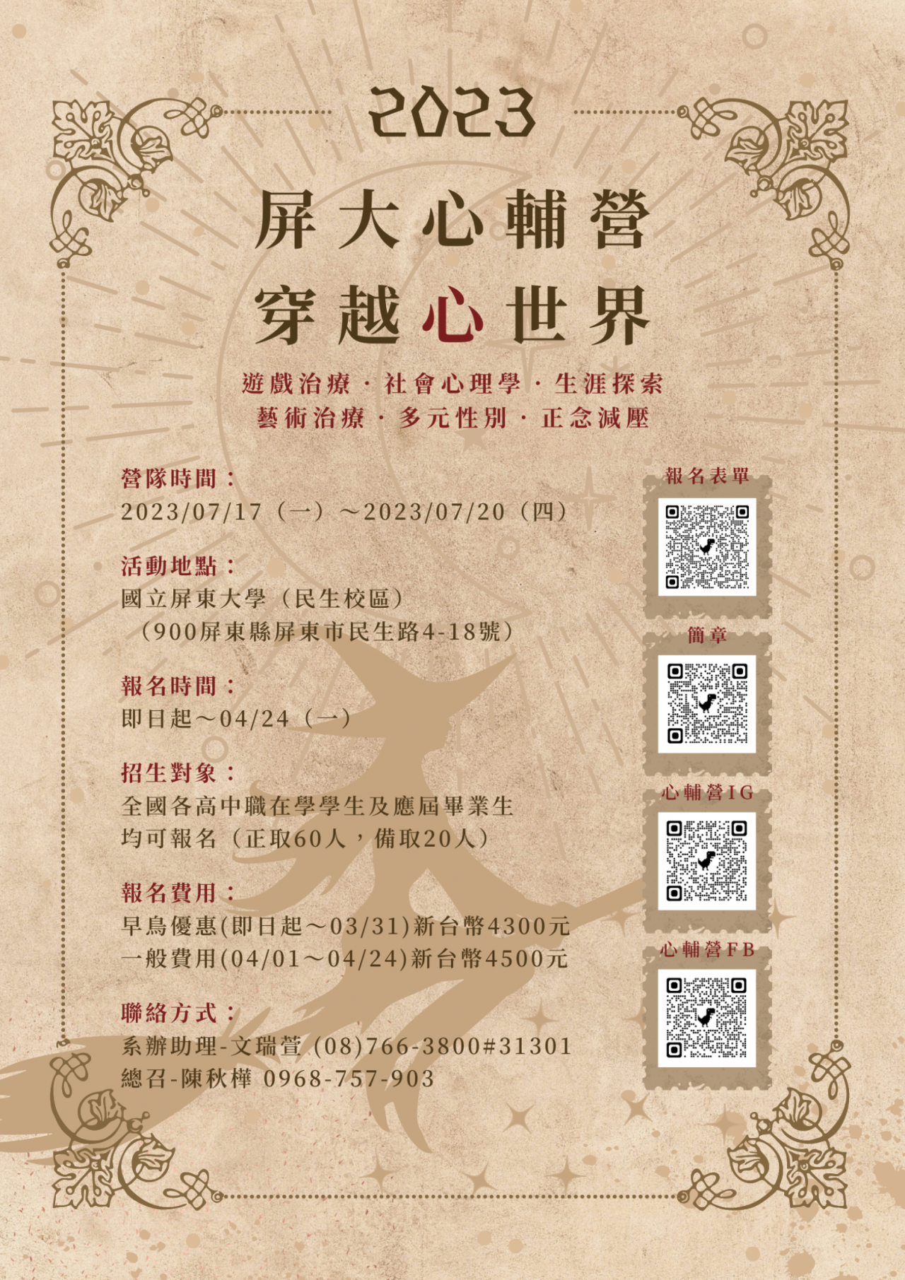 一、活動名稱: 2023 屏東大學心輔營-穿越心世界。